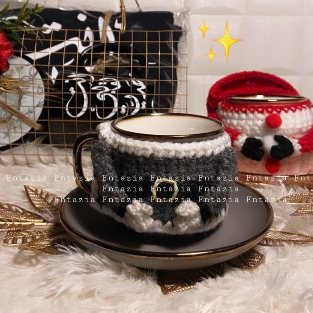 كوب مع صحن و تلبيسه شتويه رماديه اللون